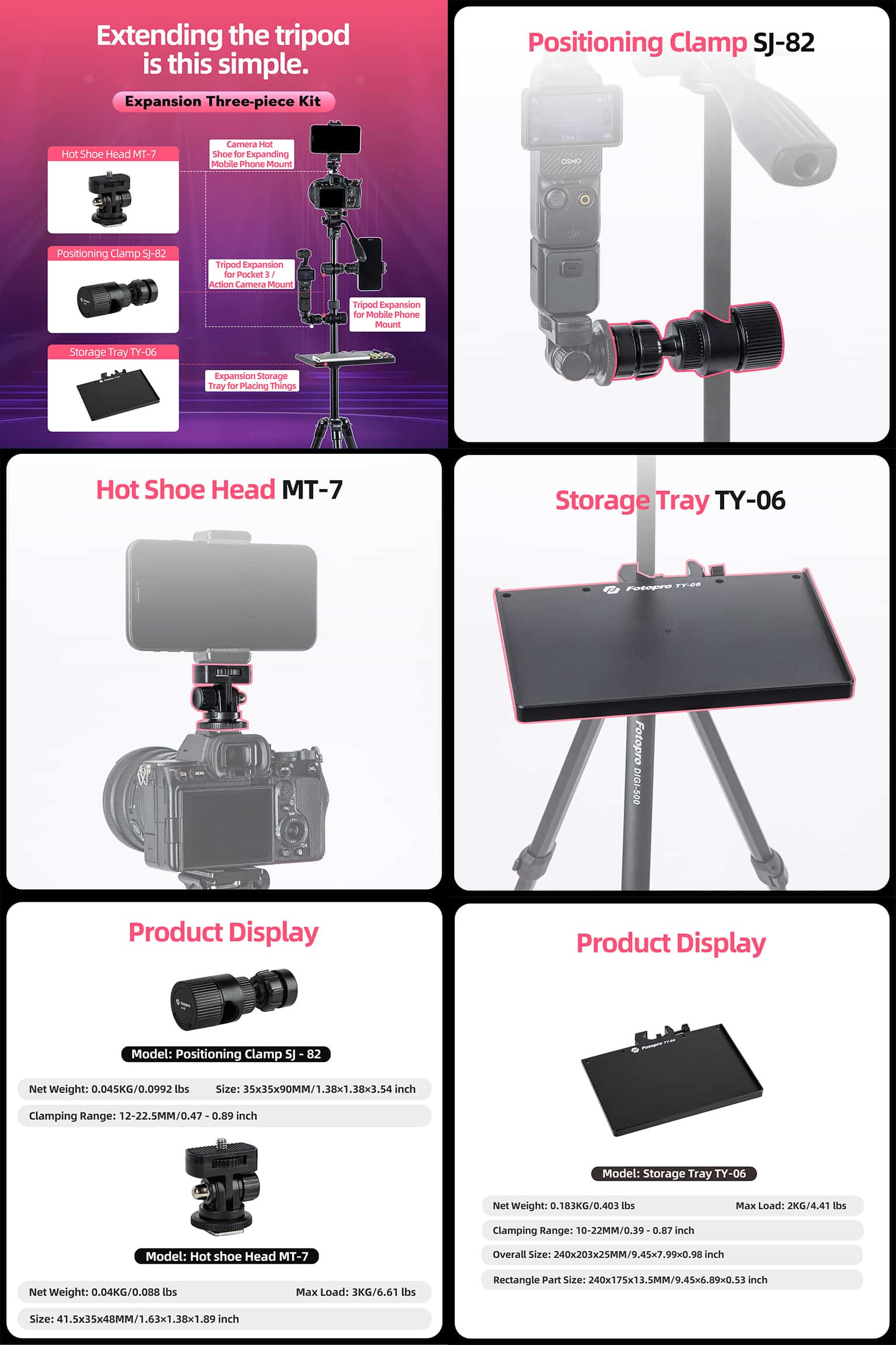 Elevate your live stream with the SJ-82 3-in-1 extension kit! This all-in-one solution includes the MT-7 hot shoe head, SJ-82 Positioning Clamp, and TY-06 Storage Tray. Achieve stable, multi-angle shots for professional-quality desktop streaming, vlogging, and online meetings. The compact and portable design allows for quick setup and easy storage. Perfect for content creators seeking a versatile and clutter-free livestreaming accessory kit.