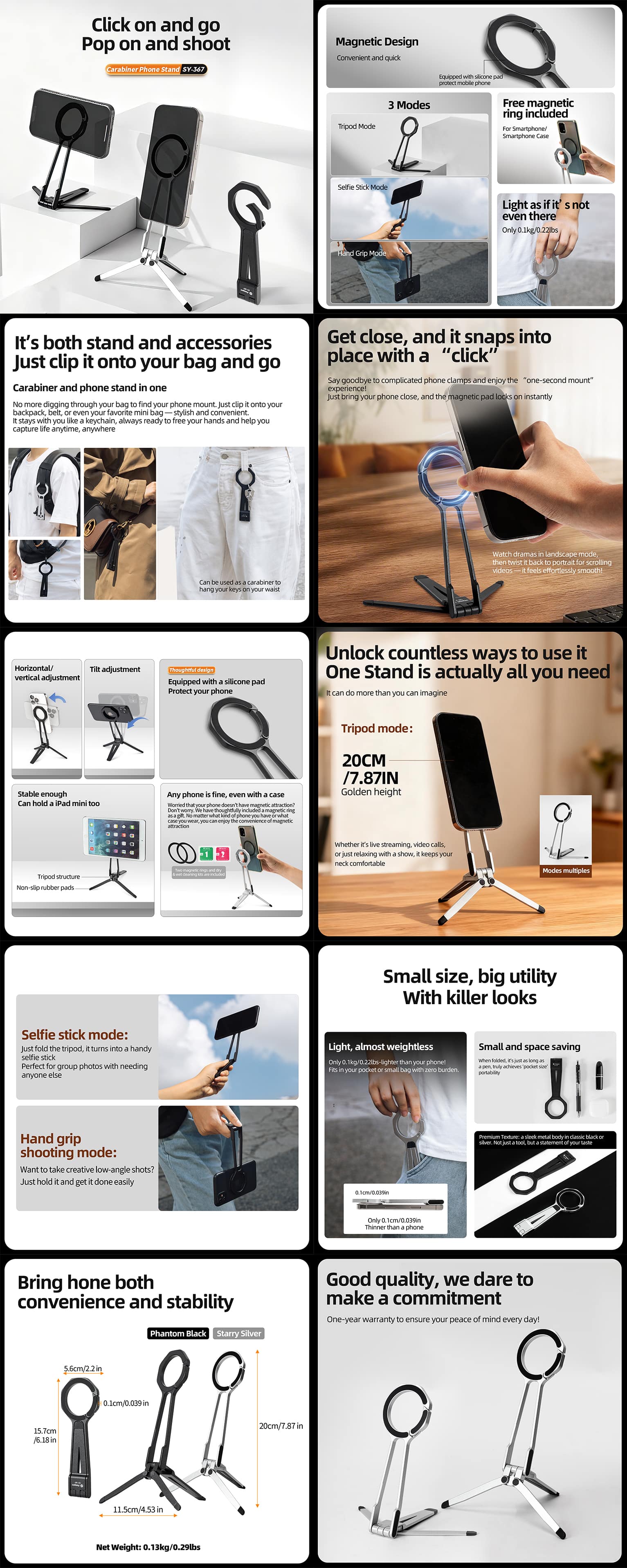 Clip SY-367 to your bag for instant hands-free shots. 3-in-1 magnetic phone stand works as tripod, selfie stick & hand grip, holds any phone or iPad mini, weighs only 0.1 kg/0.22 lb. Free magnetic ring included.